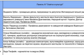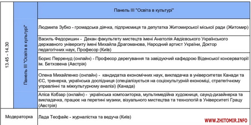 Спікери панелі «Освіта в культурі»: Людмила Зубко – громадська діячка, підприємниця та депутатка Житомирської міської ради, Василь Федоришин - декан факультету мистецтв імені Анатолія Авдієвського державного університету ім. Михайла Драгоманова. Народний артист України, доктор педагогічних наук, професор, Народний артист України. Також онлайн участь у дискусії братимуть викладачі університетів з Канади та Австрії - Борис Перренуд та Аліса Кобзар.