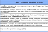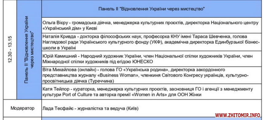 У роботі панелі «Відновлення України через мистецтво» свої погляди та досвід представлять: Ольга Вієру - громадська діячка, проєктна менеджерка, директорка Національного центру «Український дім». Вона тривалий час жила у Житомирі і добре знає і розуміє наше місто.