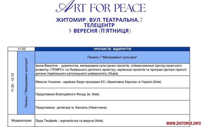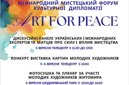До Дня міста 5 вересня у Житомирі розпочне роботу Міжнародний мистецький форум культурної дипломатії Art for Peace. Впродовж всього дня відбуватимуться цікаві події, працюватимуть дискусійні панелі українських і міжнародних експертів та митців, які об’єднані загальною темою про силу та вплив мистецтва.