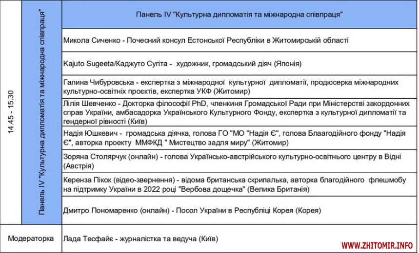 Панель «Культурна дипломатія та міжнародна співпраця» представлені такими іменами: Микола Сиченко – Почесний консул Естонської Республіки в Житомирській області, Каджуто Сугіта – художник, громадський діяч з Японії, Галина Чибуровська – експертка з міжнародної культурної дипломатії, продюсерка міжнародних культурно-освітніх проєктів, експертка УКФ (Житомир), Лілія Шевченко – докторка філософії PhD, експертка з культурної дипломатії, Дмитро Пономаренко – Посол України в Республіці Корея (онлайн) та ще декілька громадських діячів з Австрії, Британії та нашого рідного Житомира.