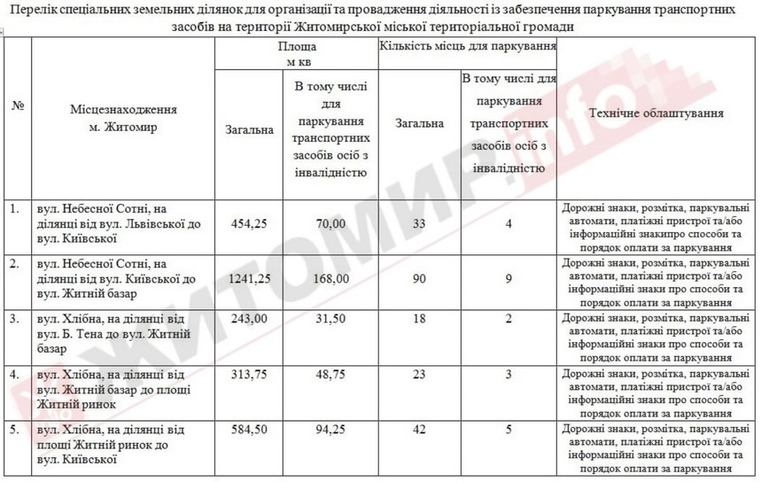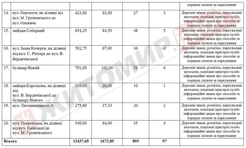 У додатку є перелік 20 ділянок загальною площею 12 тис. 437,65 кв.м, на яких буде 893 паркомісць, з них 97 – для паркування транспортних засобів осіб з інвалідністю.