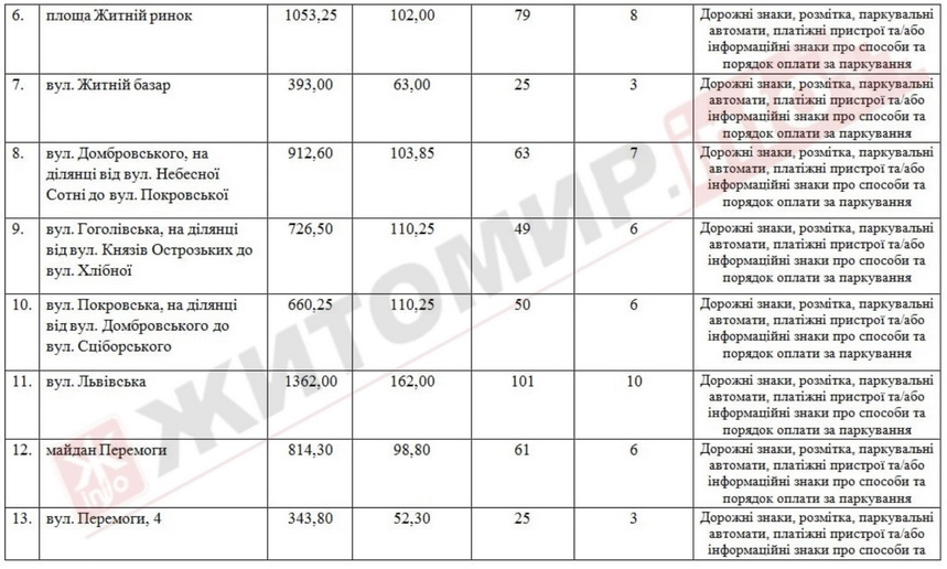 Найбільше місць для паркування буде на вулиці Львівській (101) та біля Житнього ринку: на вулиці Небесної сотні від вул. Київської до вул. Житній базар – 90, на площі Житній ринок – 79.
