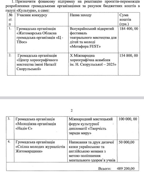 Центр хореографічного мистецтва ім. Наталії Скорульської з проєктом «X Міжнародна хореографічна асамблея ім. Н. Скорульської – 2025». Захід сприятиме патріотичному вихованню через хореографічне мистецтво, популяризації здорового способу життя, знайомству з культурною спадщиною Житомира. Сума фінансування – 154 800 грн.