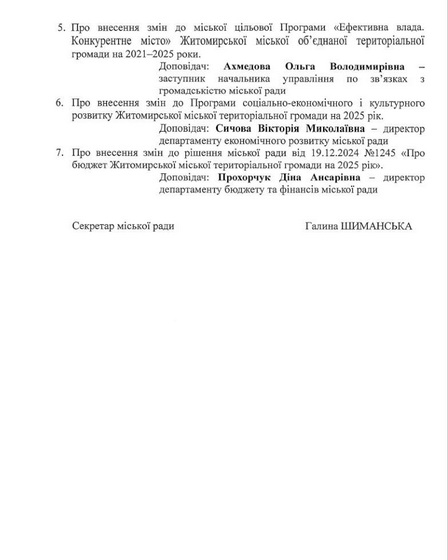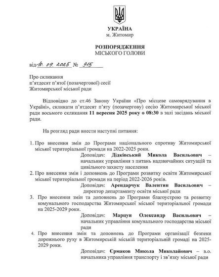 «11 вересня 2025 року о 08:30 відбудеться 55 (позачергова) сесія Житомирської міської ради восьмого скликання. Відповідне розпорядження підписала секретар міської ради Галина Шиманська», - йдеться в повідомленні.
