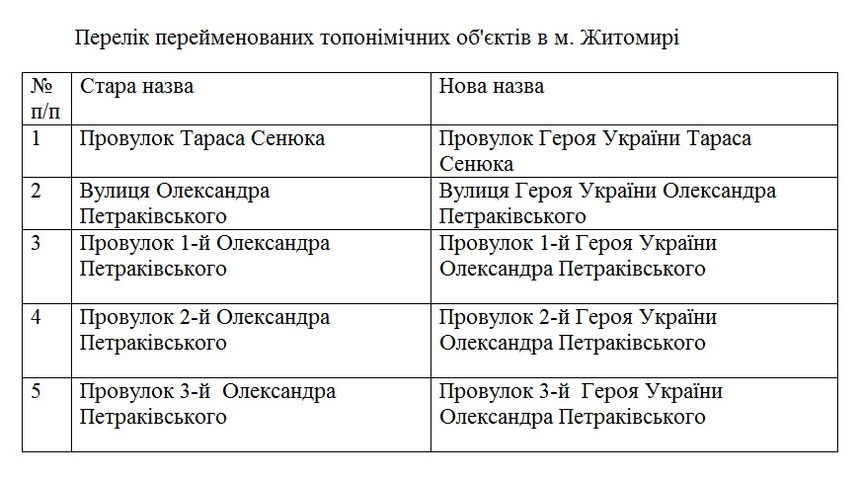 Нагадаємо, на засіданні міської комісії з топоніміки 28 квітня 2025 року розглядали питання про перейменування п’яти топонімічних об'єктів у Житомирі в частині доповнення назв виразом «Герой України».