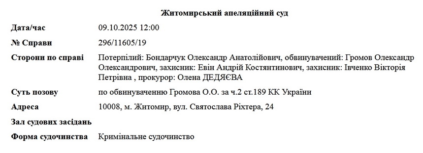 Корольовський райсуд вироком від 28 червня 2023 року присудив Громову 3,5 роки позбавлення волі. Ухвалою від 4 серпня Житомирський апеляційний суд відкрив апеляційне провадження за апеляційною скаргою на вирок.