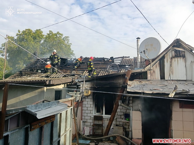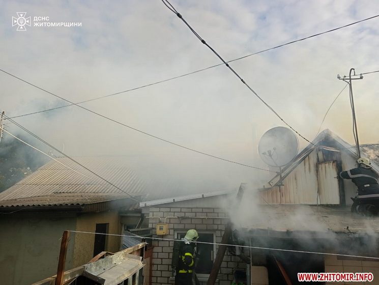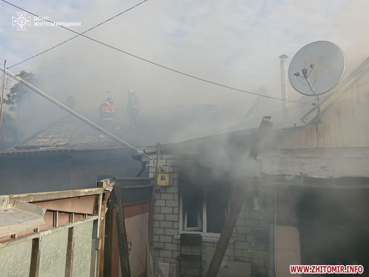 «О 07:49 до Служби порятунку «101» надійшло повідомлення про пожежу в житловому будинку на декількох господарів в м. Житомир. На місці події бійці ДСНС встановили, що загоряння виникло в кімнаті однієї з квартир, звідки вогонь поширився на дах. Існувала загроза розповсюдження полум’я іншими квартирами та на розташовані неподалік гараж та ще один житловий будинок», - інформує ГУ ДСНС.
