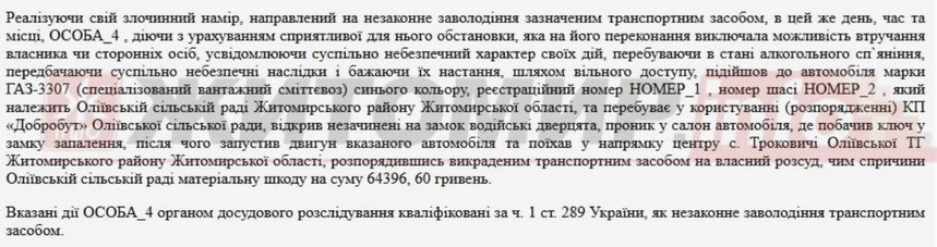 Згідно з вироком, 27 липня близько 22:00 години житомирянин, перебуваючи в стані алкогольного сп`яніння, вирішив викрасти ГАЗ-330 з території КП «Добробут» Оліївської сільської ради Житомирського району.