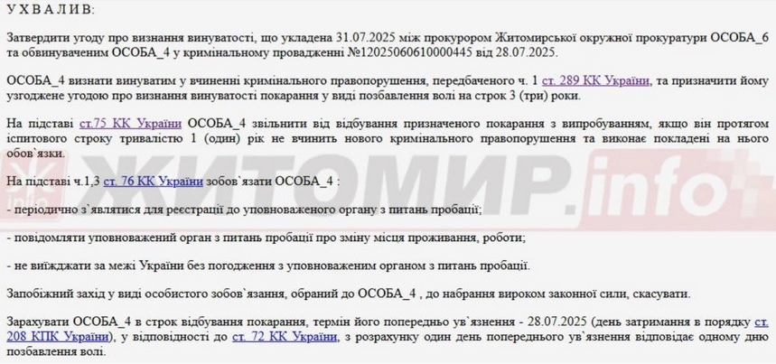 Вирок Черняхівського районного суду Житомирської області від 8 вересня оприлюднений у Єдиному державному реєстрі судових рішень 10 вересня 2025 року.