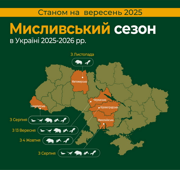 «Станом на 12.09.2025 відома інформація про погодженні Накази на відкриття сезону полювання 2025-2026 обласними військовими адміністраціями деяким користувачам мисливських угідь», - йдеться у повідомленні.