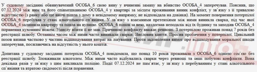 Як відомо з вироку, раніше неодноразово судимий обвинувачений вранці 7 грудня 2024 року, перебуваючи у нетверезому стані, посварився зі своєю співмешканкою. Остання, уникаючи конфлікту, вийшла на вулиці, проте чоловік наздогнав її, схопив за шию та, утримуючи на місці, зі значною силою наніс два удари ножем.