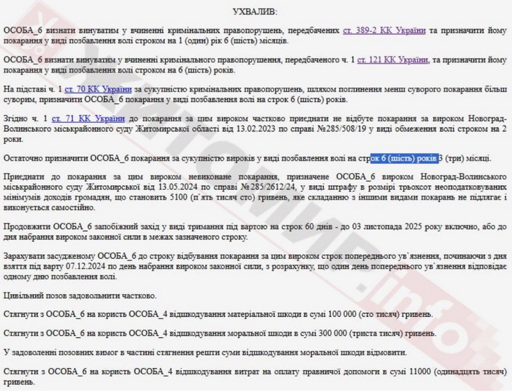 Вирок Звягельського міськрайонного суду Житомирської області від 5 вересня оприлюднений в Єдиному державному реєстрі судових рішень 8 вересня.