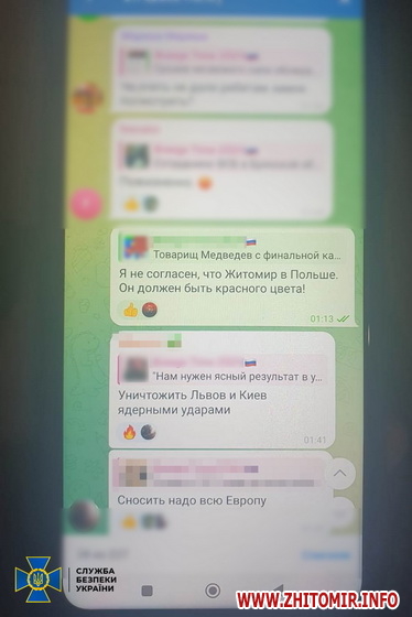 Зауважимо, у пресслужбі Житомирської обласної прокуратури повідомили, що 53-річний житель Житомира приєднався до Telegram-канали з метою поширення серед невизначеного кола осіб закликів до вчинення умисних дій зі зміни меж території або державного кордону України, висловлювань на приниження національної честі та гідності українців та українського народу.