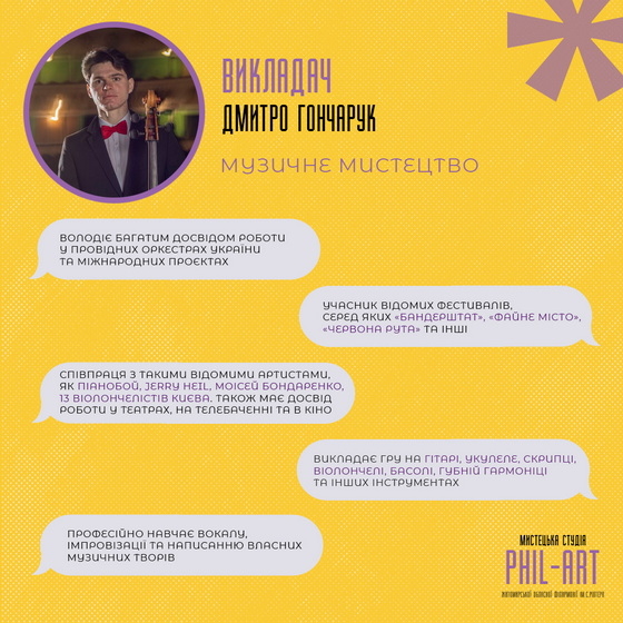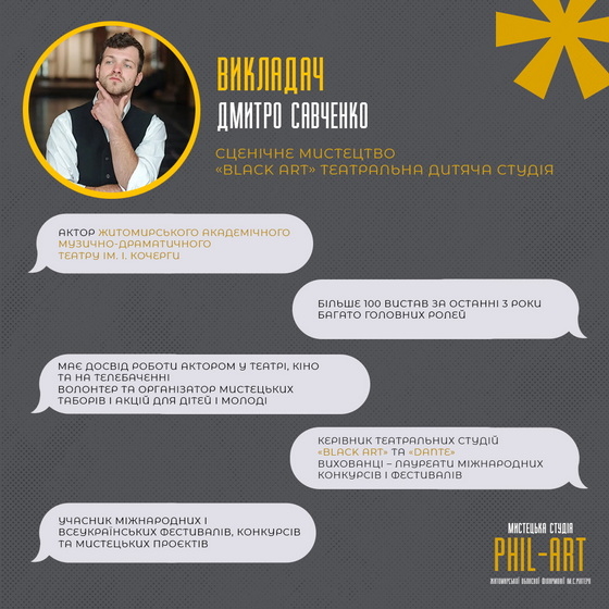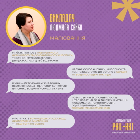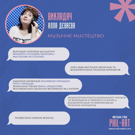 Мистецька студія «Phil-Art» Житомирської обласної філармонії ім. С. Ріхтера – це простір творчості, натхнення та гармонії, де поєднуються різні мистецькі напрямки. Наразі у нас працюють два основні творчі напрямки — малювання та музичне мистецтво. Але це тільки початок! Скоро ми відкриємо нові горизонти і представимо ще більше творчих можливостей.