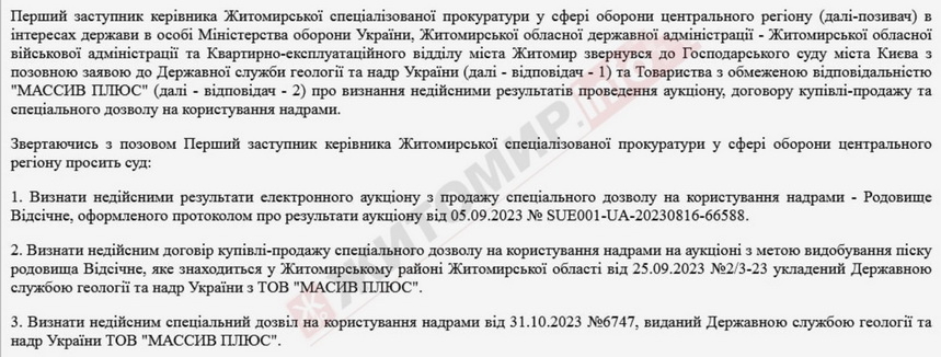 Житомир.info знайшов матеріали суду по цій справі: ухвалою від 21 травня 2025 року Господарський суд м.Києва відкрив провадження за позовом першого заступника керівника Житомирської спеціалізованої прокуратури у сфері оборони центрального регіону в інтересах держави в особі Міністерства оборони України, Житомирської обласної державної (військової) адміністрації, Квартирно-експлуатаційного відділу міста Житомир до Державної служби геології та надр України та товариства з обмеженою відповідальністю «Массив Плюс».