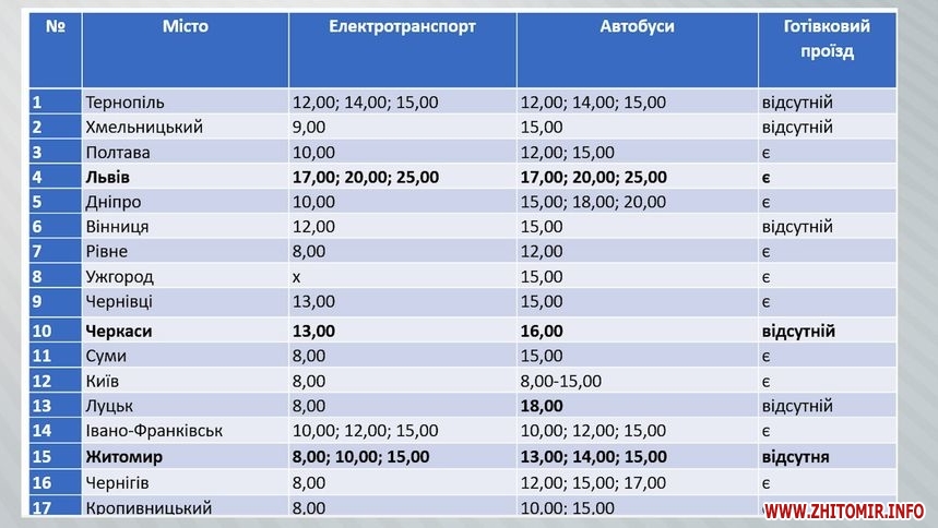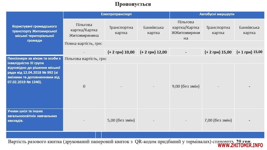 «Збільшили вартість проїзду транспортною карткою в електротранспорті з 8 до 10 грн, банківською карткою ціна змінилася з 10 до 12 грн. В автобусних перевезеннях проїзд транспортною картою змінюється з 13 до 15 грн, банківською карткою коштуватиме 15 грн. Також збільшилася вартість разового квитка, які продаються в терміналах, користувачів таких квитків – 0,7 %. Замість 15 грн разовий квиток коштуватиме 20 грн», – розповідає в.о. начальника управління транспорту і зв’язку Житомирської міської ради Микола Єрмаков.