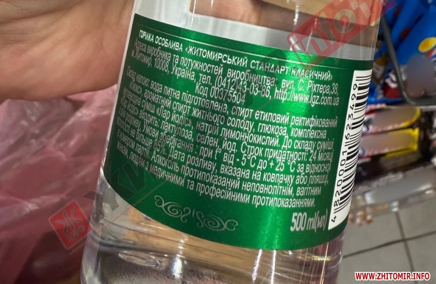 Зокрема, у продажу є горілка «Житомирський стандарт класичний» та «Житомир сучасна», на обох видах є етикетки з логотипом державного підприємства «Житомирський лікеро-горілчаний завод», адреса потужностей виробництва – м.Житомир, вул. С. Ріхтера, 38 та напис «Якість гарантована державою» (див. фото нижче).
