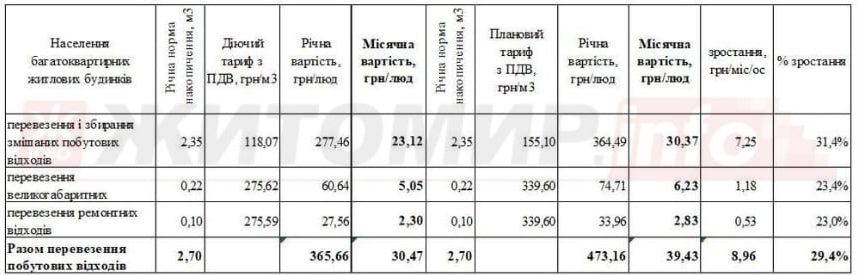 Як повідомляв Житомир.info, в серпні 2022 року виконавчий комітет Житомирської міської ради ухвалив рішення про нові тарифи для населення на вивезення сміття: ТОВ «Ґрін Бін Україна» - збільшення на 20%, КАТП-0628 – на 19,4%, ПП «КВЖРЕП №8» - на 15%.