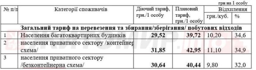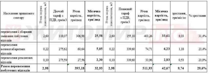 Для приватного сектору по контейнерній схемі зараз 31,85 грн на 1 людину, плановий показник – 42,95 грн, зростання на 11,10 грн (34,9%). По безконтейнерній схемі зараз 30,64 грн на 1 людину, плановий показник – 40,44 грн, зростання на 9,80 грн (32%).