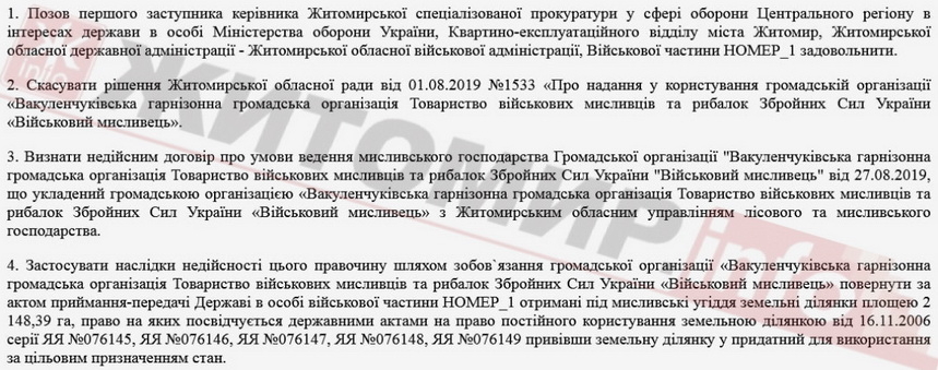 «Господарський суд міста Києва задовольнив позов Житомирської спеціалізованої прокуратури у сфері оборони Центрального регіону та визнав незаконним рішення обласної ради, яким громадській організації мисливців і рибалок надали в користування понад 2 тис. га земель оборони на 25 років. Також суд скасував договір про ведення мисливського господарства», - йдеться у повідомленні.