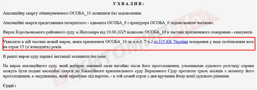 Заслухавши усі сторони, Житомирський апеляційний суд призначив обвинуваченому 15 років тюрми.