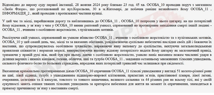 Як повідомляв Житомир.info, у Житомирі біля ботанічного саду ввечері 28 жовтня 2024 року вбили 33-річного працівника одного з місцевих підприємств, який повертався з вечірньої зміни. 7 листопада 2024 року відділ комунікації поліції Житомирської області повідомив, що правоохоронці затримали 18-річного житомирянина, якого підозрювали у жорстокому вбивстві чоловіка. У червні Корольовський районний суд м. Житомира призначив покарання 18-річному житомирянину, який 95 разів вдарив ножем чоловіка за відмову дати йому цигарки. Юнака визнали винним та призначили 14 років тюрми. Житомирська обласна прокуратура не погодилася із вироком та підготувала апеляційну скаргу у зв’язку з м’якістю призначеного покарання.