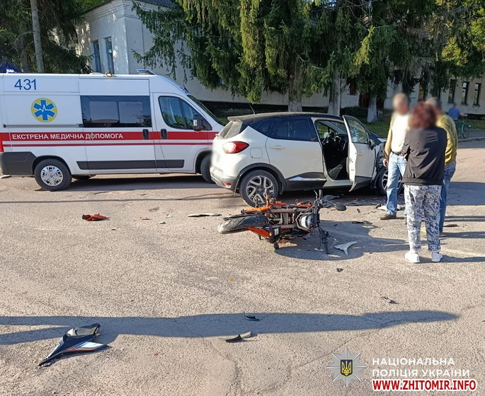 У результаті ДТП мотоцикліст отримав травми, його госпіталізовано до Коростенської центральної міської лікарні. Інші учасники події тілесних ушкоджень не отримали.