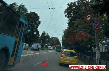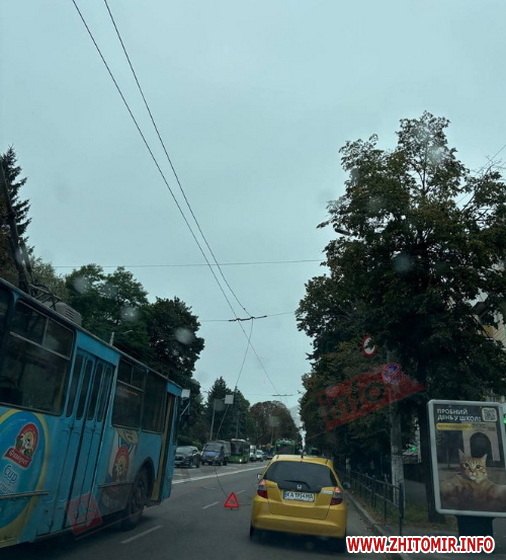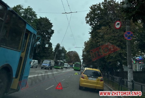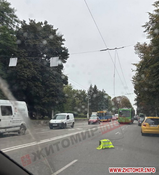 У Житомирі вдень 24 вересня на перехресті вулиць Велика Бердичівська та Жуйка зупинилися тролейбуси, над дорогою видно обірвані дроти.