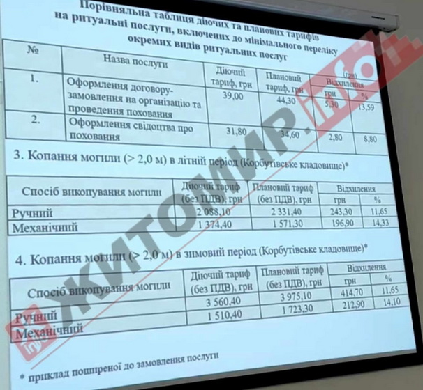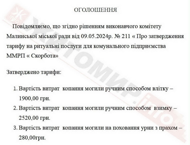 Нагадаємо, в жовтні 2024 року КП «Спеціалізований комбінат комунально-побутового обслуговування» Житомирської міської ради затвердили нові тарифи на ритуальні послуги, зокрема: копання могили ручним способом в літній період – 2331,4 грн (без ПДВ), копання могили ручним способом у зимовий період – 3975,1 грн (без ПДВ).