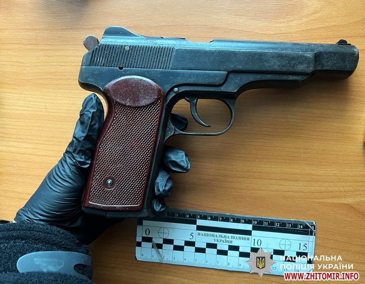 У Житомирі поліцейські затримали чоловіка, який стріляв у чоловіка, що гостював у товариша. Під час обшуків у підозрюваного вилучили гранату, пістолет та набої.