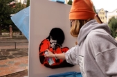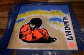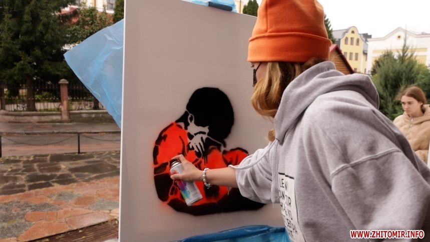 «Сьогодні я у Житомирі відтворила картину Богдана Зізи, його псевдонім «Сирота», тож наш проєкт називається «Для сироти». Ми плануємо проєкт реалізувати в Черкасах та ще в 9 містах України. Богдан Зіза – це кримський політв’язень, який у 2022 році зробив перформанс: облив жовтою та блакитною фарбами будівлю адміністрації у Євпаторії, у Криму. За це він отримав 15 років ув’язнення у російській в’язниці. Картина зроблена, як омаж, тобто творча копія роботи Богдана Зізи. Я створила сьогодні костюм цьому хлопчику-сироті у кольорах, наче він ув’язнений, адже Богдан Зіза наразі у в’язниці. Дуже важливим для мене були жовто-блакитні хвилі, тут я поєднала те, що робив Богдан у травні 2022 року, тобто я зімітувала ці хвилі й вони наче огортають цього хлопчика. Змішала дві концепції його робіт, щоб зміцнити наш посил до сироти, що цей хлопчик колись буде звільнений, буде вдома, огорнутий жовто-блакитним прапором», – розповідає мисткиня кримськотатарського походження.