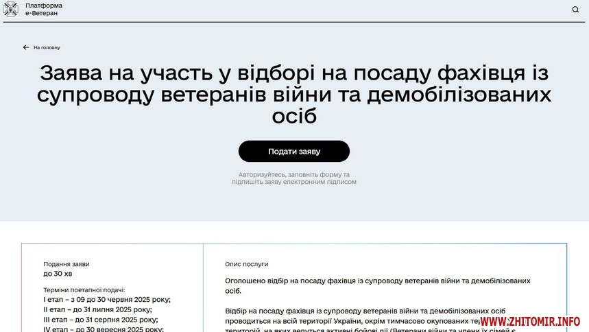 Детальну інформацію та контакти фахівця можна знайти в застосунку «Дія» у вкладці «ветеран PRO». У Житомирі є потреба у фахівцях із супроводу ветеранів, зараз є 2 вакантні посади.