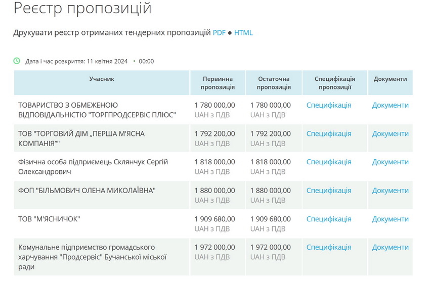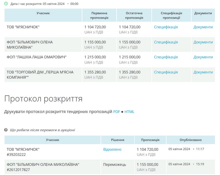 Тендер з очікуваною вартістю 1 млн 465 тис. 550 грн проводили в квітні 2024 року на торги подали заявки 4 учасники – кріт трьох, яких підозрюють у змові, було ще черкаське ТОВ «Торговий дім «Перша м'ясна компанія», у ТОВ «М’ясничок» була найдешевша пропозиція 1 млн 104 тис. 720 грн, але її відхилили і переможцем стала Більмович Олени Миколаївни з пропозицією 1 млн 155 тис. грн.