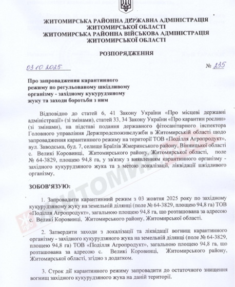 «Запроваджено карантинний режим по західному кукурудзяному жуку (Diabrotica virgifera virgifera Le Conte) у Житомирській області, Житомирському районі, ТОВ «Поділля Агропродукт» загальною площею 94,8 га. Розпорядження Житомирської районної державної/військової адміністрації від 03.10.2025 № 235», - йдеться в повідомленні.