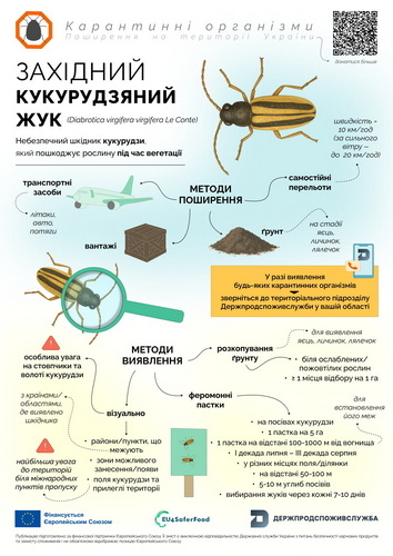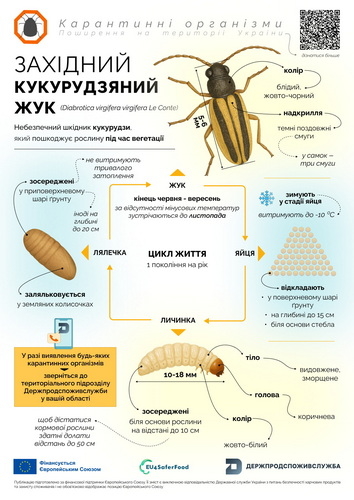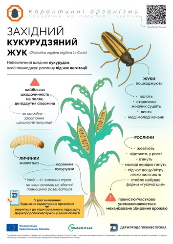 За інформацією Держпродспоживслужби західний кукурудзяний жук (Diabrotica virgifera virgifera Le Conte) — це небезпечний шкідник, який шкодить посівам кукурудзи під час вегетації. Його личинки живляться корінням, а дорослі жуки — волоттю, качанами й листям. Через пошкодження рослини слабшають, вилягають, гірше розвиваються, уражуються хворобами, а збирання врожаю стає ускладненим.