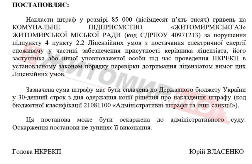 «Комісія з перевірки в перший день перевірки 22.09.2025 о 09:30 годині прибула за місцезнаходженням Ліцензіата, що зазначене у Ліцензійному реєстрі НКРЕКП та Заяві про отримання ліцензії з постачання електричної енергії споживачу. За даною адресою знаходиться триповерхова офісна будівля, а саме Житомирська міська рада Житомирської області та Виконавчий комітет Житомирської міської ради Житомирської області. Вивіска, або будь-які написи з назвою КП «ЖИТОМИРМІСЬКГАЗ» ЖИТОМИРСЬКОЇ МІСЬКОЇ РАДИ, які свідчать про місцезнаходження КП «ЖИТОМИРМІСЬКГАЗ» ЖИТОМИРСЬКОЇ МІСЬКОЇ РАДИ за даною адресою, на фасаді будівлі або у будь-якому іншому місці всередині будівлі відсутня. Фактичного знаходження представників Підприємства комісією з перевірки не встановлено», - йдеться у проєкті постанови.