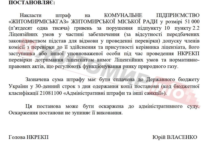 За неможливість провести перевірку КП «Житомирміськгаз» хочуть оштрафувати на 85 тис. грн.