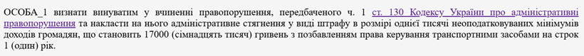 Суд постановив: «ОСОБА_1 визнати винуватим у вчиненні адміністративного правопорушення, передбаченого ч. 1ст. 130 КУпАП, та накласти на нього адміністративне стягнення у вигляді штрафу на користь держави у розмірі однієї тисячі неоподатковуваних мінімумів доходів громадян, що становить 17 000 (сімнадцять тисяч) гривень із позбавленням права керування транспортними засобами на строк 1 рік».