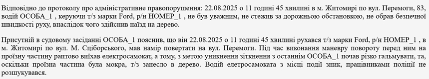 Присутній в судовому засіданні ОСОБА_1 пояснив, що він 22.08.2025 о 11 годині 45 хвилині рухався т/з марки Ford (…) в м. Житомирі по вул. М. Сціборського, мав намір повертати на вул. Перемоги. Під час виконання маневру повороту перед ним на проїзну частину раптово виїхав електросамокат, а тому, з метою уникнення зіткнення з останнім ОСОБА_1, почав різко гальмувати, та, оскільки проїзна частина була мокра, т/з занесло в дерево. Водій елетросамоката з місці події зник, працівниками поліції не розшукувався», – відомо з постанови.