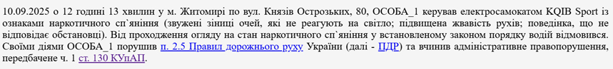 «10.09.2025 о 12 годині 13 хвилин у м. Житомирі по вул. Князів Острозьких, 80, ОСОБА_1 керував електросамокатом KQIB Sport із ознаками наркотичного сп`яніння (звужені зіниці очей, які не реагують на світло; підвищена жвавість рухів; поведінка, що не відповідає обстановці)», – зазначено у постанові Богунського районного суду м. Житомира від 30 вересня 2025 року.
