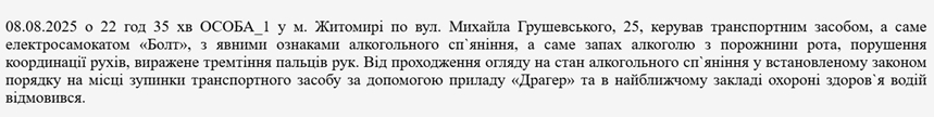 «08.08.2025 о 22 год 35 хв ОСОБА_1 у м. Житомирі по вул. Михайла Грушевського, 25, керував транспортним засобом, а саме електросамокатом «Болт», з явними ознаками алкогольного сп`яніння, а саме запах алкоголю з порожнини рота, порушення координації рухів, виражене тремтіння пальців рук. Від проходження огляду на стан алкогольного сп`яніння у встановленому законом порядку на місці зупинки транспортного засобу за допомогою приладу «Драгер» та в найближчому закладі охороні здоров`я водій відмовився», – йдеться у постанові.