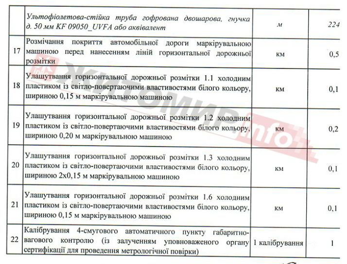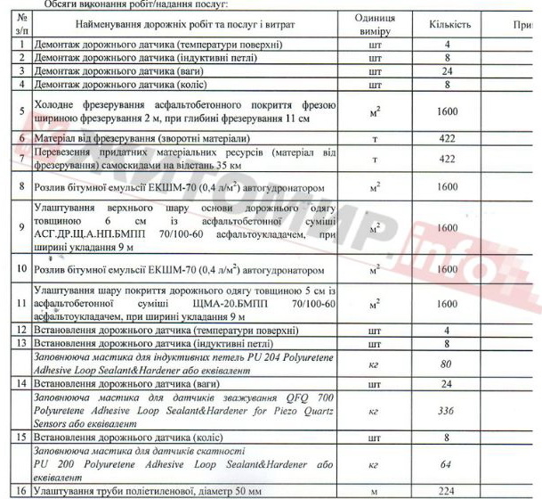 В тендерній документації зазначено, що на ділянці траси Виступовичі – Житомир – Могилів-Подільський треба замінити такі датчики: температури поверхні – 4 шт.; індуктивні петлі – 8 шт.; ваги – 24 шт.; коліс – 8 шт. Також підрядник має виконати інші роботи, нижче – скриншот з тендерної документації: