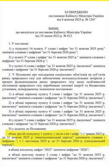 «Як зазначається в документі, ГК «Нафтогаз Трейдинг» та ГК «Нафтогаз Трейдинг» повинні розраховувати фіксовані обсяги природного газу для постачання виробникам тепла враховуючи, що опалювальний період триватиме з 1 листопада 2025 року до 31 березня 2026 року. В попередні сезони відповідні рішення не впливали на фактичні терміни опалювального сезону, тому що питання про його початок та закінчення вирішувала місцева влада», - пише видання.