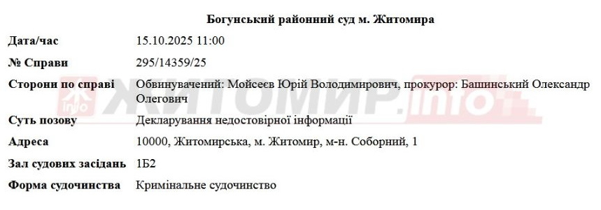 На сайті Богунського районного суду м.Житомира є інформація про те, що судове засідання у справі Мойсеєва призначене на 15 жовтня 2025 року.
