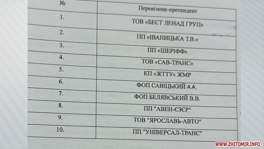 «На об’єкт конкурсу №1 подалися ЖТТУ і ПП «Шеріфф», об’єкт №2 подалися ПП «Шеріфф», ТОВ «Сав-Транс», ТОВ «Ярославь-авто», на об'єкт конкурсу №3 подалися ФОП Білявський В.В., ПП «Іваницька Т.В.», на об’єкт №4 подалися ПП «Шеріфф», ПП «Авен-Єзєр», об’єкт №5 подалися ПП «Шеріфф», ПП «Універсал-транс», об’єкт №7 подалися ФОП Білявський, ПП «Іваницька Т.В.ФОП Савіцьки А.А.», с, – зачитав Олександр Шевчук.