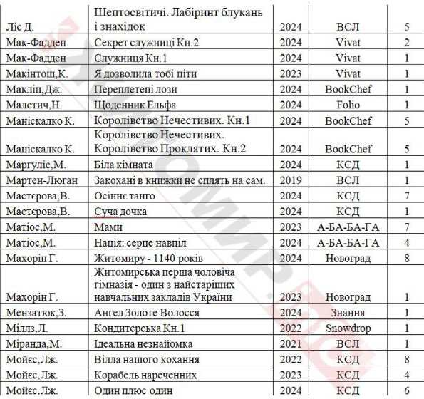В жовтні 2024 року для комунальних бібліотек Житомирської громади купили 956 книг (253 найменування), за які ФОП Домославська Марія Вікторівна отримала 289 тис. 178,85 грн.