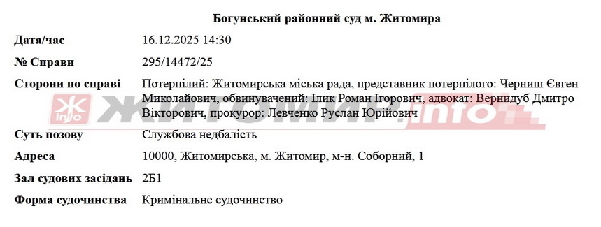 Богунський районний суд м.Житомира отримав обвинувальний акт щодо службової недбалості директора комунального підприємства «Житомирводоканал» Романа Ілика.