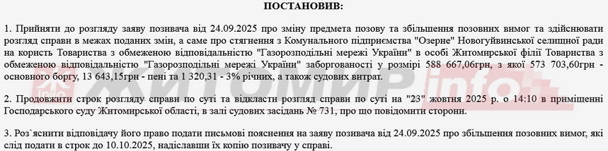 Наприкінці серпня 2025 року Господарський суд Житомирської області відкрив провадження за позовом Житомирської філії ТОВ «Газорозподільні мережі України» до КП «Озерне» Новогуйвинської селищної ради про стягнення 290 тис. 325,46 грн заборгованої оплати послуг з розподілу природного газу, наданих у липні 2025 року. Наприкінці вересня позовні вимоги були збільшені до 588 тис. 667,06 грн – додали борг за серпень 2025 року.
