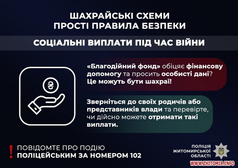 Як повідомляв Житомир.info, у квітні 2025 року 40-річна житомирянка хотіла отримати міжнародну допомогу, натомість втратила понад 20 тисяч гривень. Зі слів заявниці, напередодні до неї зателефонував «представник» однієї з міжнародних організацій. Він розповів про можливість отримання благодійної виплати у зв’язку з повномасштабним вторгненням рф.