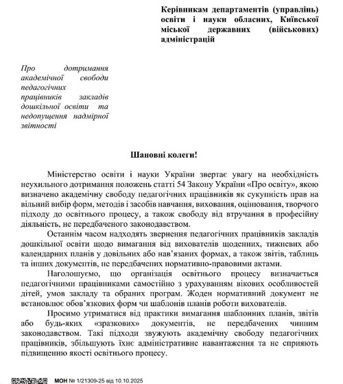 «Останнім часом надходять звернення педагогічних працівників закладів дошкільної освіти щодо вимагання від вихователів щоденних, тижневих або календарних планів у довільних або нав’язаних формах, а також звіті, таблиць та інших документів, не передбачених нормативно-правовими актами», - йдеться у листі.